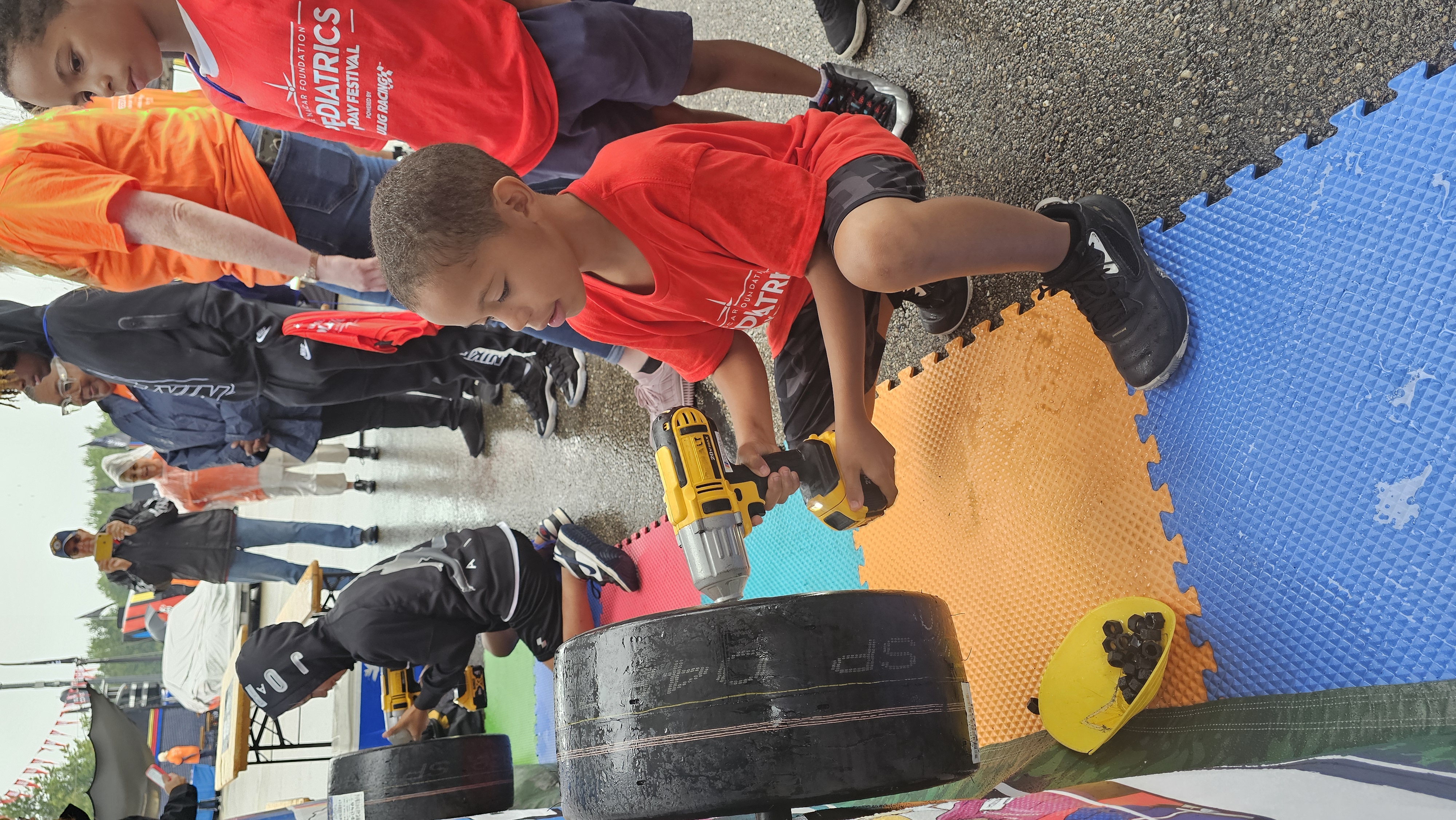 There were many fun activities for the children attending, including “pit crew” (changing tires on a toy racecar), a tire-rolling relay race, water games, and music at the stage area.